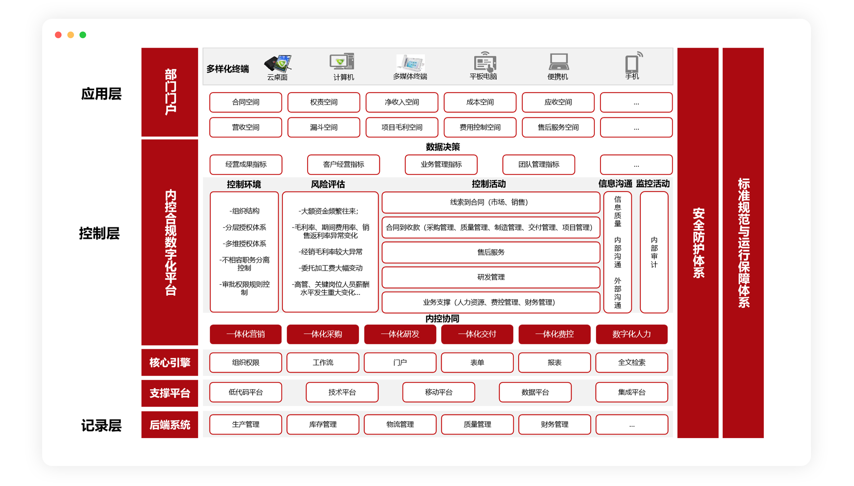 緻遠(yuǎn)【專精特新內(nèi)控合規數(shù)字化£®(huà)平台解決方案】以內(nèi)控合規管理λ×(lǐ)為(wèi)主旨,将企業(yè)從(cóng)研發、設計(j≠™ì)、生(shēng)産(加密、刻盤等)、采購(gòu)、項目管→÷♦'理(lǐ)、市(shì)場(chǎng)、銷售、交付、服務、人(rén)力φ$到(dào)财務的(de)全鏈條打通(tōn 'αg),構建合規內(nèi)控內(nèi)置的(de)一(yī ∑γ←)體(tǐ)化(huà)內(nèi)控合規數(shù)字化(huà)管₩δ理(lǐ)平台,有(yǒu)效将內(nèi)控制(zhì)度落實到(dào×♠δ)各以業(yè)務流程審批節點,實現(xiàn)信息端對®→♠§(duì)端一(yī)緻、傳遞無斷點,數(shù)據真實、一(yī)緻、可(♠÷±αkě)追溯,提升企業(yè)整體(tǐ)運營效率,∞'支撐企業(yè)有(yǒu)序發展、合規經營≤。