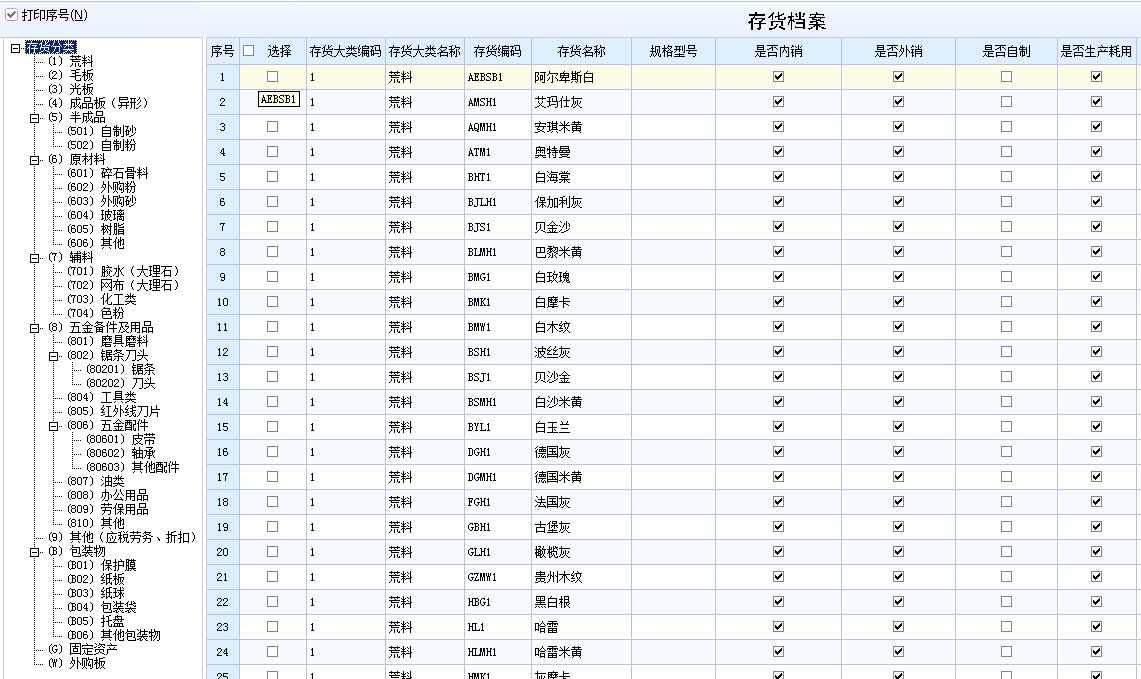 取編碼用(yòng)品名首字母大(dà)寫組成+1位數(sh≥πδ ù)字組成(1荒料、2毛闆、3光(guāng)闆、4成品闆"♥)。