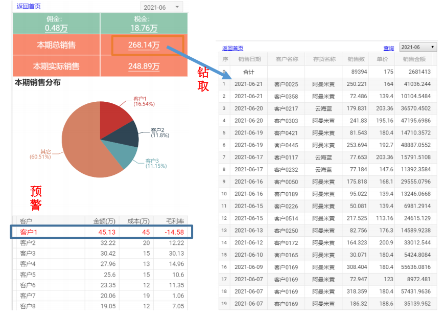 支持圖表穿透、鑽取聯動、報(bào)表文(wén)字預警、圖形β≈預警、儀表盤預警、排序等各種多(duō)維分(fēn)析。