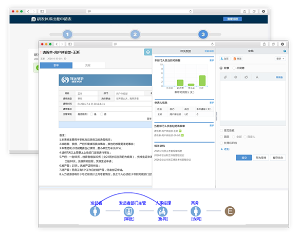 流程随時(shí)申請(qǐng),移動快(kuài)速審批; 可(kě)'∞加簽、會(huì)簽、知(zhī)會(huì)和(h₽♦é)回退等,使移動審批更靈活方便。