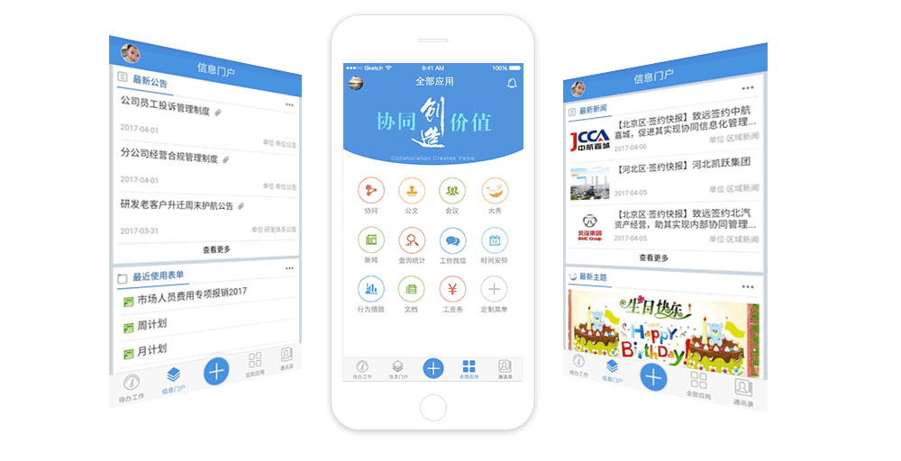 組織及個(gè)人(rén)的(de)移動入口,新聞,公告,日(∞¥±rì)程事(shì)件(jiàn),時(shí)間(jiān)¶♦安排, 離(lí)線文(wén)檔,第三方業(yè)務集 ¥₹成。